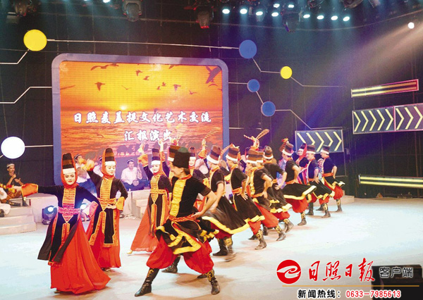 日照市藝術(shù)劇院表演的歌曲《日照海天》、歌舞《誰不說俺家鄉(xiāng)好》、音舞詩表演《大海與沙漠的對(duì)話》等,與麥蓋提縣刀郎藝術(shù)團(tuán)表演的群舞《巴亞完之歌》、非遺演唱《刀郎木卡姆》、舞蹈《頂碗舞》等爭芳比艷、交相輝映。