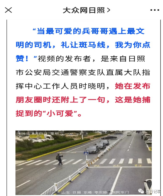 隨著創城工作的逐漸推進,如今在日照,“禮讓斑馬線“可以說達成了共識,已經成為生活中比較常見的場景。兵哥哥和司機在斑馬線前相互尊重的畫面,就生動詮釋了“你為我駐足,我為你致敬”的感動。
