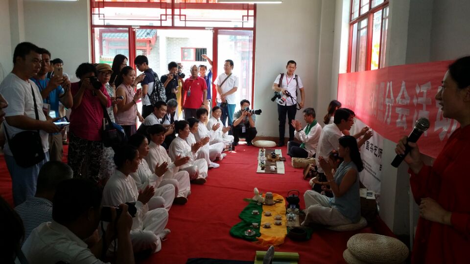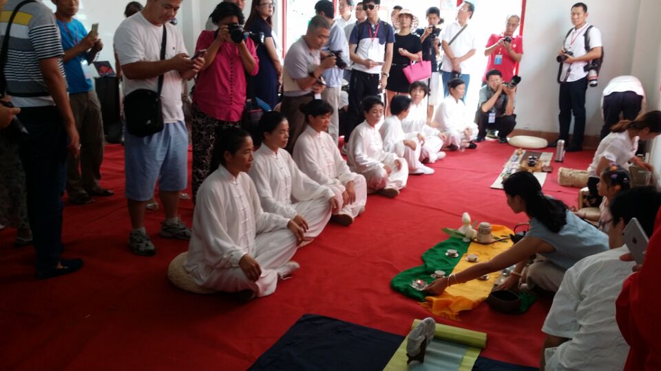 25日下午,茶博城太極禪茶表演吸引了采風團成員。8月24日至27日,日照市召開中國絲綢之路經濟帶城市報業聯盟成立大會暨黨報跨界融合創新發展年會,同時開展百家媒體社長總編看魅力日照采風活動。(記者 夏宗偉 攝)