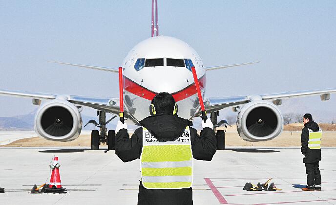 2月10日,在日照山字河機場,地勤人員引導航班停機。