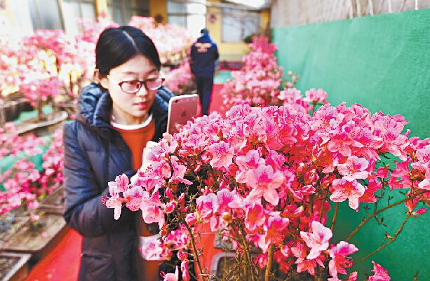 2月12日,市民在東港區南湖鎮花卉基地欣賞映山紅。 春節期間,很多市民居家休息、走親訪友、參加聚會,也有不少市民攜家帶口,就近安排一次短途游,到家鄉的某些景點走一走看一看,領略身邊的風光,感受新春氣息。 (本報記者 路杰 攝)