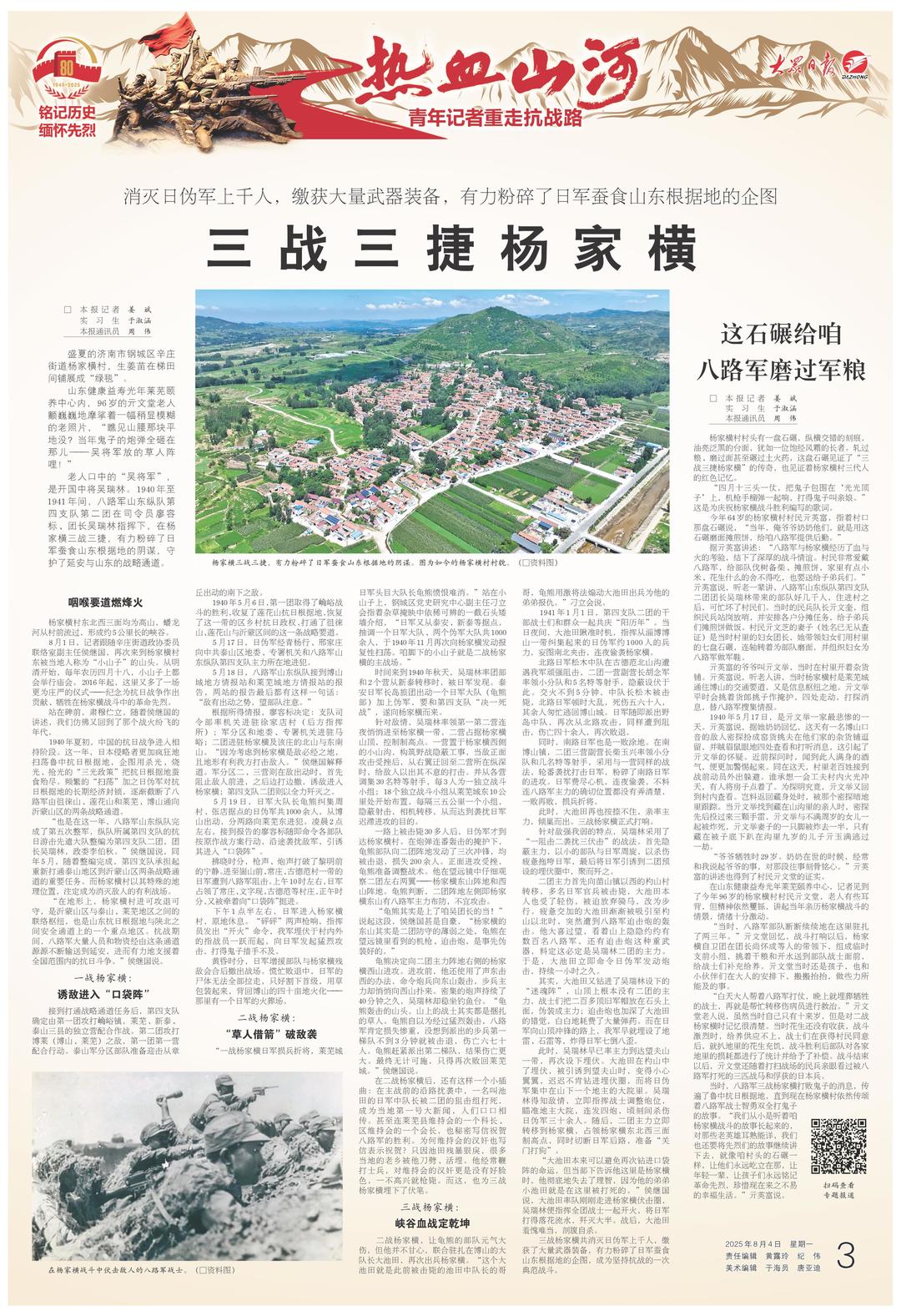 今年是中國人民抗日戰爭暨世界反法西斯戰爭勝利80周年。大眾日報·大眾新聞推出“銘記歷史 緬懷先烈——熱血山河·青年記者重走抗戰路”系列融媒報道。青年記者重走熱血抗戰路,在跨越時空對話中銘記歷史、緬懷先烈,全方位展現山東人民英勇抗戰精神。
