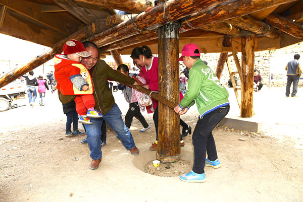 搭建秋千用木棒、木板、鐵絲、繩索、“牛鎖頭”等農(nóng)村常見物品和農(nóng)具。秋千節(jié)所立大桿,高十余米,在大桿頂端裝有“米”字形8根挑翅,形如倒置傘骨,挑翅末端各栓有兩米多雙股繩索,下連一個“牛鎖頭”代替千板,如此8根挑翅系8個“牛鎖頭”,間隔均勻,成為8個“座位”。大桿基部裝一磨盤轉(zhuǎn)動機(jī)關(guān),人們推動大桿飛速旋轉(zhuǎn)大桿,坐在秋千上的人就會隨著秋千飛起來。