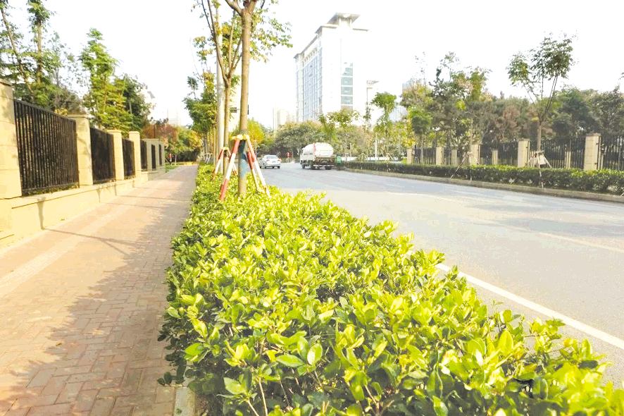 “破硬還綠”主要是把行道樹下基本不具有通行功能的道板換成灌木,形成綠籬,并和喬木有機(jī)結(jié)合,形成立體綠化效果。這種栽植方式其實(shí)是一種“套種”方式,充分利用行道樹下空間栽植灌木,實(shí)現(xiàn)了喬灌木的有機(jī)結(jié)合,讓喬灌木分別在高、中兩層錯(cuò)開生長(zhǎng)。“套種”方式在不增加新增用地的情況下,形成道路綠化立體效果的同時(shí),有效增加了城市綠量。在推進(jìn)綠籬栽植時(shí),還采用間隔栽植方式,增加了道路綠化色彩,進(jìn)一步提升了市民的出行體驗(yàn)。