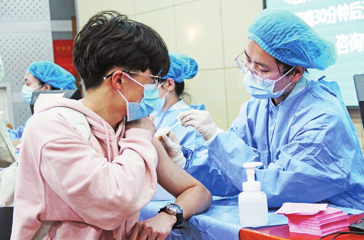 4月9日,曲阜師范大學(日照校區)學生們在接種新冠疫苗。