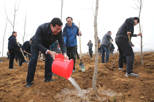 3月12日, 在日照水庫流域生態建設現場,市委副書記、市長劉星泰(左一)在植樹。