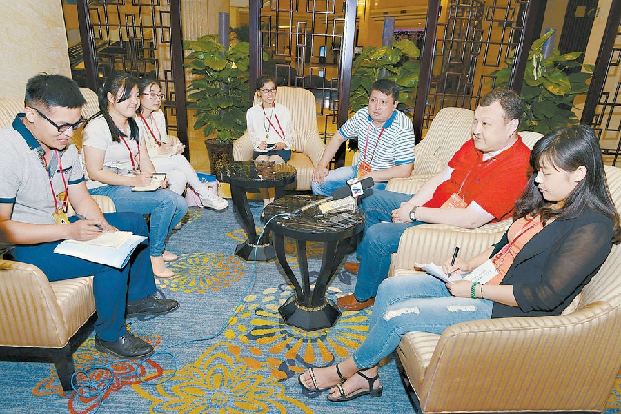6月14日,日照嵐橋錦江大酒店,媒體記者在采訪哈薩克斯坦《24KZ》哈巴爾電視臺臺長謝伊特馬梅特(右二)。當(dāng)日,參加第三屆中國-中亞合作論壇的代表和媒體記者陸續(xù)抵達(dá)日照。 (記者 陳為峰 攝)