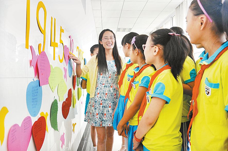 9月2日,在主題教育課堂上,老師在對學生進行愛國主義教育。 為紀念中國人民抗日戰爭暨世界反法西斯戰爭勝利70周年,日照開發區實驗小學開展“記抗戰歷史,踐核心價值,筑夢想長城”主題教育活動,通過寫心愿卡、講革命故事等方式,讓孩子們銘記歷史,圓夢中華。(記者 曹鈺迪 攝)