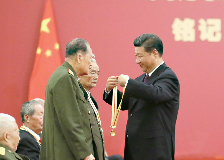 9月2日,中共中央總書記、國家主席、中央軍委主席習近平在北京人民大會堂向30名抗戰老戰士老同志、抗戰將領、幫助和支持中國抗戰的國際友人或其遺屬代表頒發中國人民抗日戰爭勝利70周年紀念章并發表重要講話。(新華社記者 蘭紅光 攝)