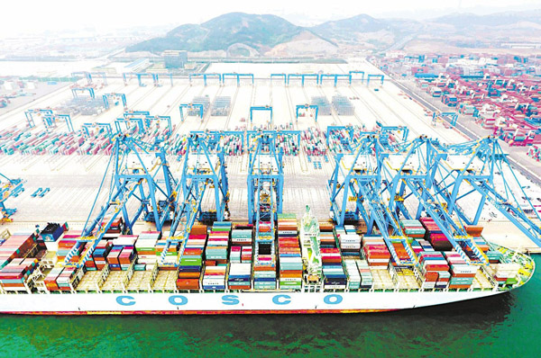 集裝箱船在青島港全自動化集裝箱碼頭靠泊作業(2017年5月10日攝)。青島港全自動化集裝箱碼頭是我國完全自主創新并設計建設的亞洲首個、全球領先的全自動化碼頭。