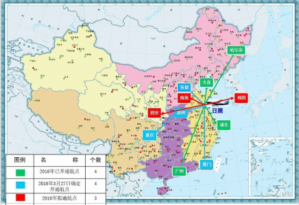 3月27日日照機場新航線開通后,運行航線將達到4條,合作航空公司4家,通航點8個,分別為北京首都、上海浦東、廣州、重慶、哈爾濱、廈門、大連、鄭