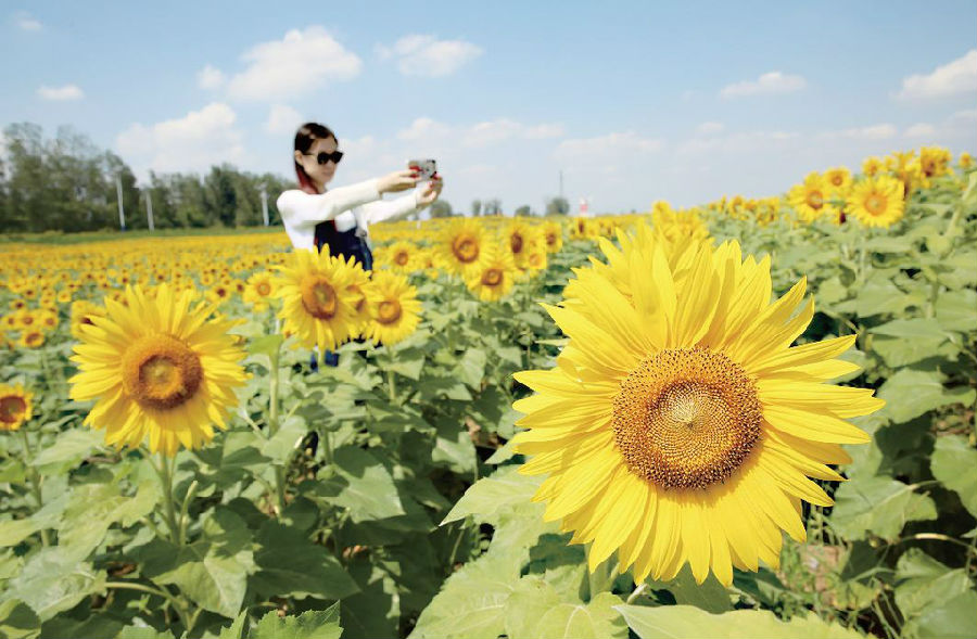 9月7日,游人在莒縣沭河公園向日葵基地內賞花拍照。 初秋時節,位于莒縣沭河公園向日葵基地的200余畝向日葵進入盛花期,金燦燦的花朵競相綻放,勾勒出一幅美麗畫卷,吸引眾多市民前來觀賞拍照。 (記者 張磊 攝)