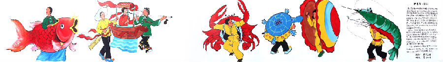 至清代,演出時就穿上畫有海洋生物圖案的服裝,臉上畫著海洋生物形象的臉譜,用鑼鼓伴奏,成了有聲有色的舞蹈。再后來,就用竹子和布料扎制魚、鱉、蝦、蟹、蚌等海洋生物模型,表演時或頂在頭上或背在背上,海洋生物動作被栩栩如生、活靈活現地展現出來。例如:魚的嘴巴張合自如,尾巴能夠隨意搖擺,蟹的爪子能伸能縮還能抓物等。