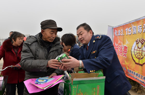 3月12日,在東港區(qū)河山大集,工商執(zhí)法人員在向農(nóng)民介紹辨別商品真?zhèn)蔚姆椒ā?br/> “3·15”消費者權(quán)益日來臨之際,市工商局開展以“維權(quán)消費農(nóng)村行”為主題的“3.15”國際消費者權(quán)益日系列宣傳活動,向農(nóng)民宣傳辨別商品真?zhèn)蔚姆椒ǎv授普及新消法知識,并現(xiàn)場接受咨詢提供維權(quán)服務(wù)。 (記者 朱元理 路杰 攝)