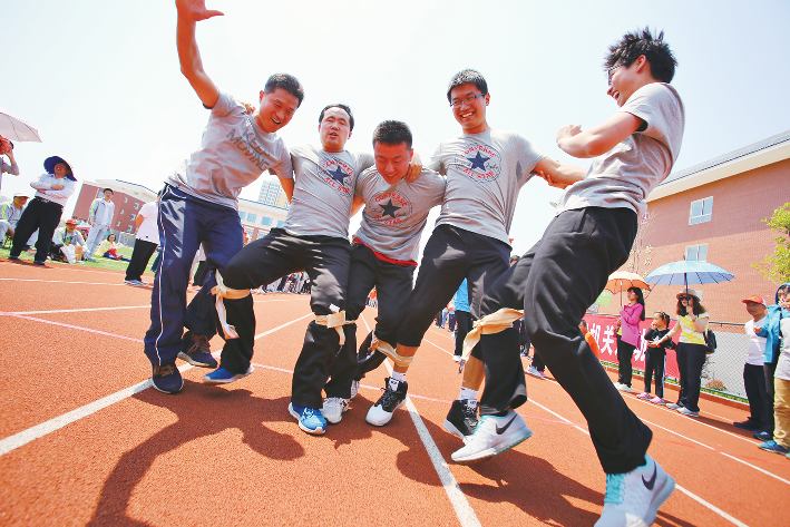 五人六足比賽現場,一組運動員到達終點線的瞬間。 5月16日上午,東港實驗學校運動場人聲鼎沸,東港區全民健身運動會暨第四屆機關運動會火爆進行,1200余名來自區直各部門、各鎮、街道的干部職工參加了抱球接力、五人六足、搭橋過河等10個項目的比賽。(記者 冷炳豪 攝)