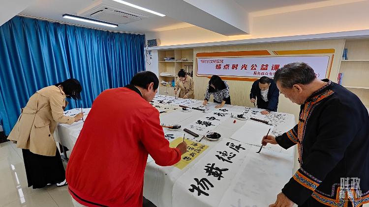△廣西南寧市多民族社區(qū)——盤(pán)龍社區(qū)居民練習(xí)書(shū)法。(總臺(tái)央視記者楊立峰拍攝)