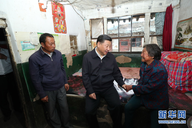 6月21日,中共中央總書記、國家主席、中央軍委主席習近平到山西考察調研。這是習近平來到忻州市岢嵐縣趙家洼村看望貧困村民王三女。新華社記者 龐興雷 攝