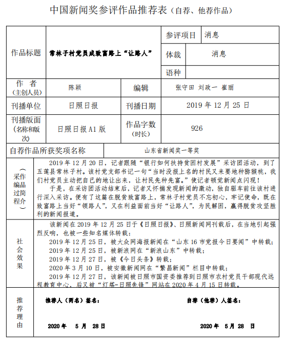 經上級主管單位批準,個人自薦《常林子村黨員成致富路上“讓路人”》(刊發于2019年12月25日《日照日報》頭版)參加第三十屆中國新聞獎消息類作品評選,現對作品參評材料進行公示,接受公眾監督,公示期6月2日至8日。