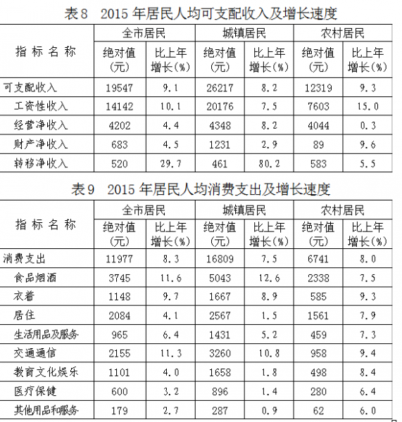 城鄉居民收入穩定增長。全市居民人均可支配收入19547元,增長9.1%,扣除價格因素,實際增長7.8%。其中,城鎮居民人均可支配收入26217元,增長8.2%,扣除價格因素,實際增長6.9%;農村居民人均可支配收入12319元,增長9.3%,扣除價格因素,實際增長8.0%。城鎮居民人均消費支出16809元,增長7.5%,農村居民人均消費支出6741元,增長8.0%。