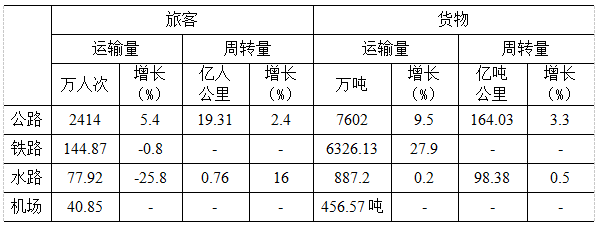 交通運輸業穩定發展。全年完成地方公路客運量2414萬人次,增長5.4%;公路貨運量7602萬噸,增長9.5%。海上客運量77.92萬人次,下降25.8%;海上貨運量887.2萬噸,增長0.2%。鐵路發送旅客量144.87萬人次,下降0.8%;鐵路貨運量6326.13萬噸,增長27.9%。機場客運量40.85萬人次,貨運量456.57噸。