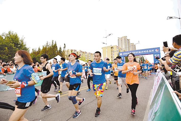 圖為 9月25日,參加2016日照10K公路沙灘馬拉松比賽的運動員從市人民廣場起點出發。