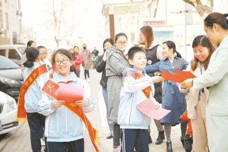 3月19日,學(xué)生志愿者們?cè)谖迳徛废蚴忻癜l(fā)放文明交通宣傳材料。