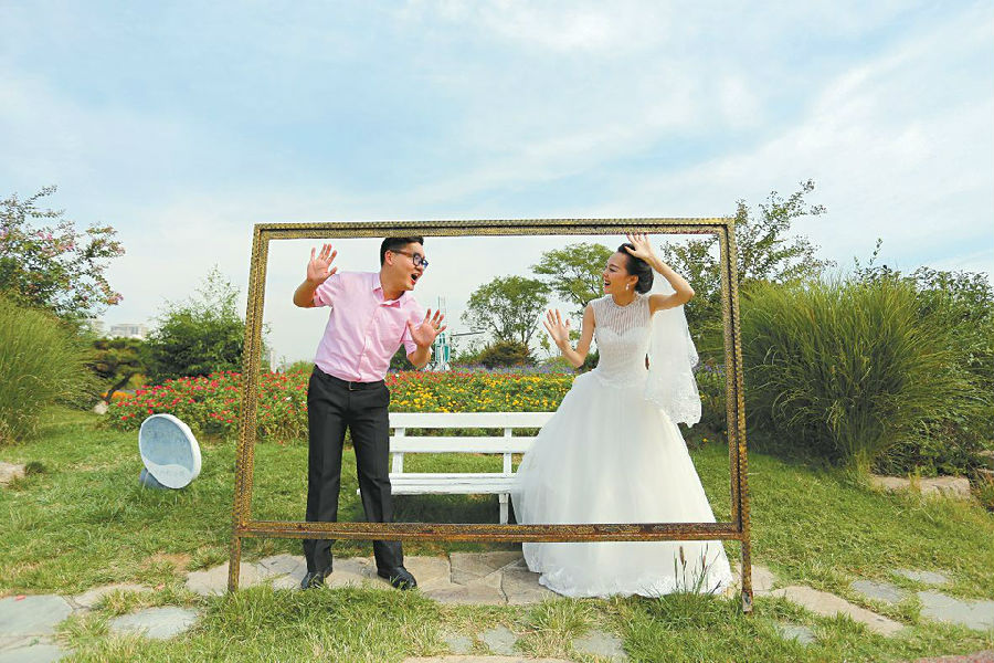 9月15日,一對新人在植物園內拍攝結婚照。 幾場秋雨過后,空氣里開始漸漸褪去夏日的燥熱,秋日的植物園景色格外秀美,置身于這草木蔥翠,鮮花爛漫的美景中,盡享藍天碧水的清新與歡暢。很多市民趁著好天氣出門游玩,享受難得的秋日風景。(記者 惠雪燁 攝)