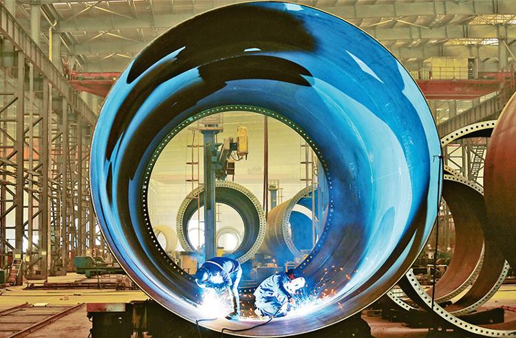 圖為2023年2月8日,江蘇省太倉港經濟技術開發區,蘇州天順新能源科技有限公司生產人員正在焊接風電塔筒單節筒體,奮力實現首季“開門紅”。 人民圖片 計海新/攝
