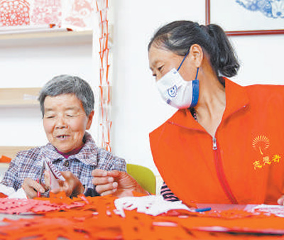 日照市嵐山區虎山鎮黃家峪村養老服務中心內,志愿者在陪老人剪紙。